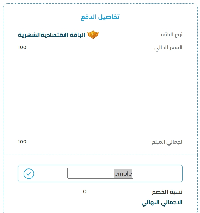 الأولى: عن طريق ادخال الكود الخاص بك في صفحة الاشتراك: في حال التسويق للاشتراكات في الباقات عن طريق رابط الاشتراك الالكتروني يقوم التاجر باضافة كود الدعوة في خانة كود الخصم الخاص بالاشتراك كما في الصورة